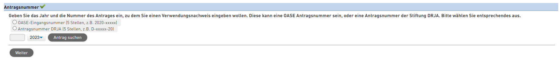<figure><img src="https://1751385044-files.gitbook.io/~/files/v0/b/gitbook-x-prod.appspot.com/o/spaces%2FcgPC54ZSE43kZTH1ztIs%2Fuploads%2FAku5bG4rBcCQPTyISDhG%2FVerwendungnachweis.png?alt=media&#x26;token=96abf604-6616-45f7-aeab-4270547128d5" alt=""><figcaption><p>OASE - Eingabe Verwendungsnachweis</p></figcaption></figure>