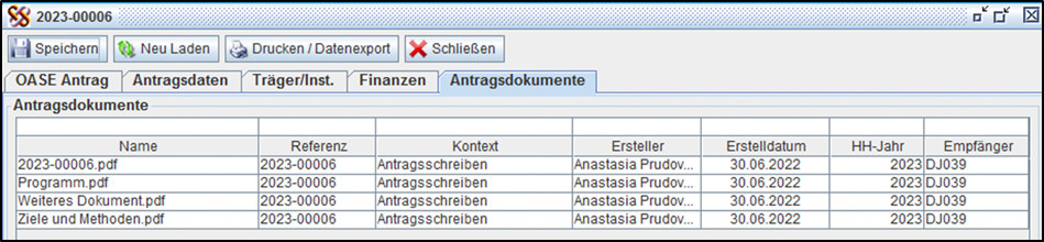 Im Reiter *Antragsdokumente* ist die Zusammenfassung des OASE-Antrages in Form eines PDF-Dokumentes zu finden (hier: *2023-00006*). Dieses Dokument hat die antragstellende Person nach Antragstellung in OASE per E-Mail erhalten.