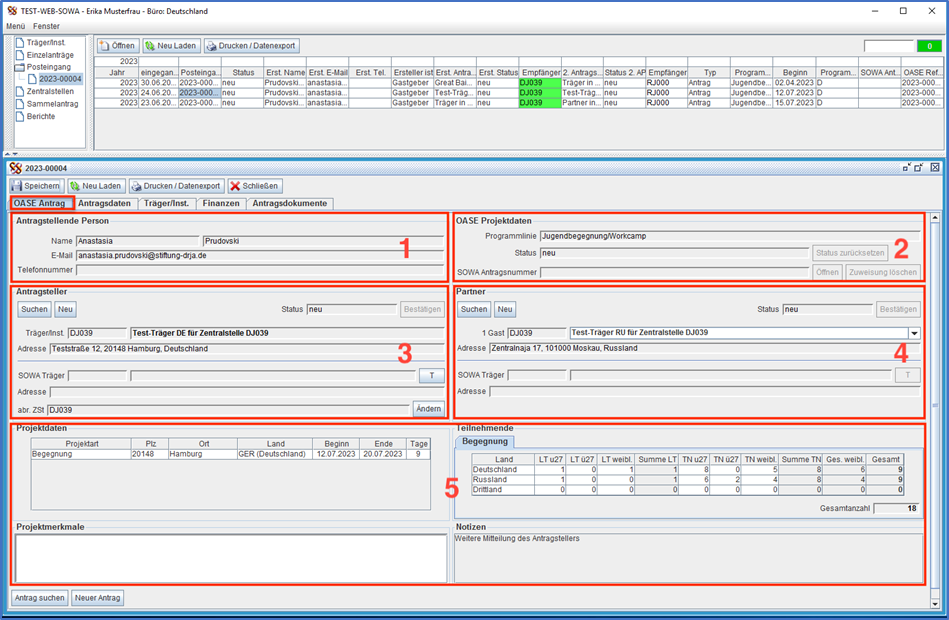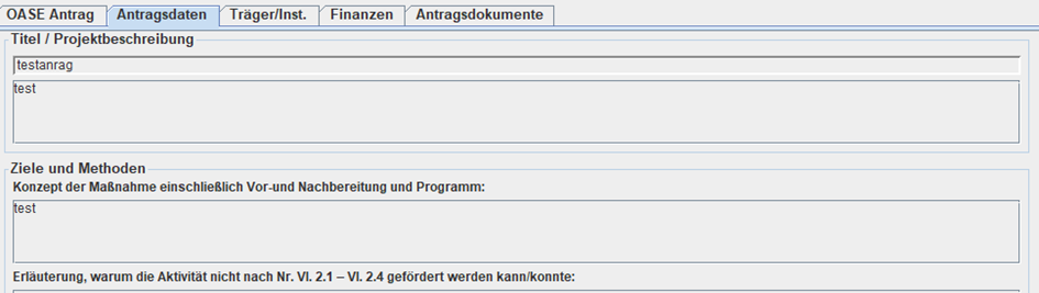 Die Bereiche des OASE-Antrages im Posteingang zur Erklärung: